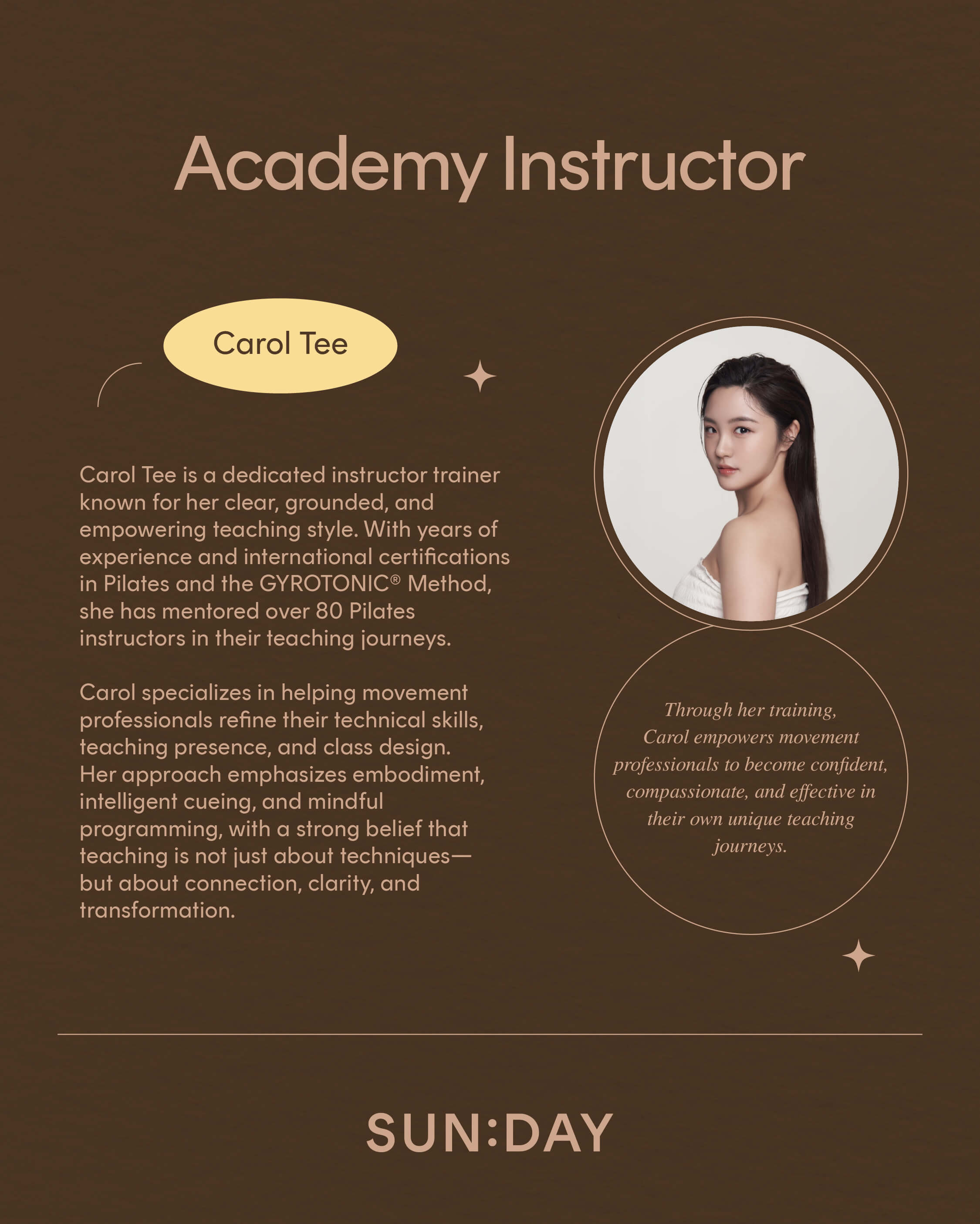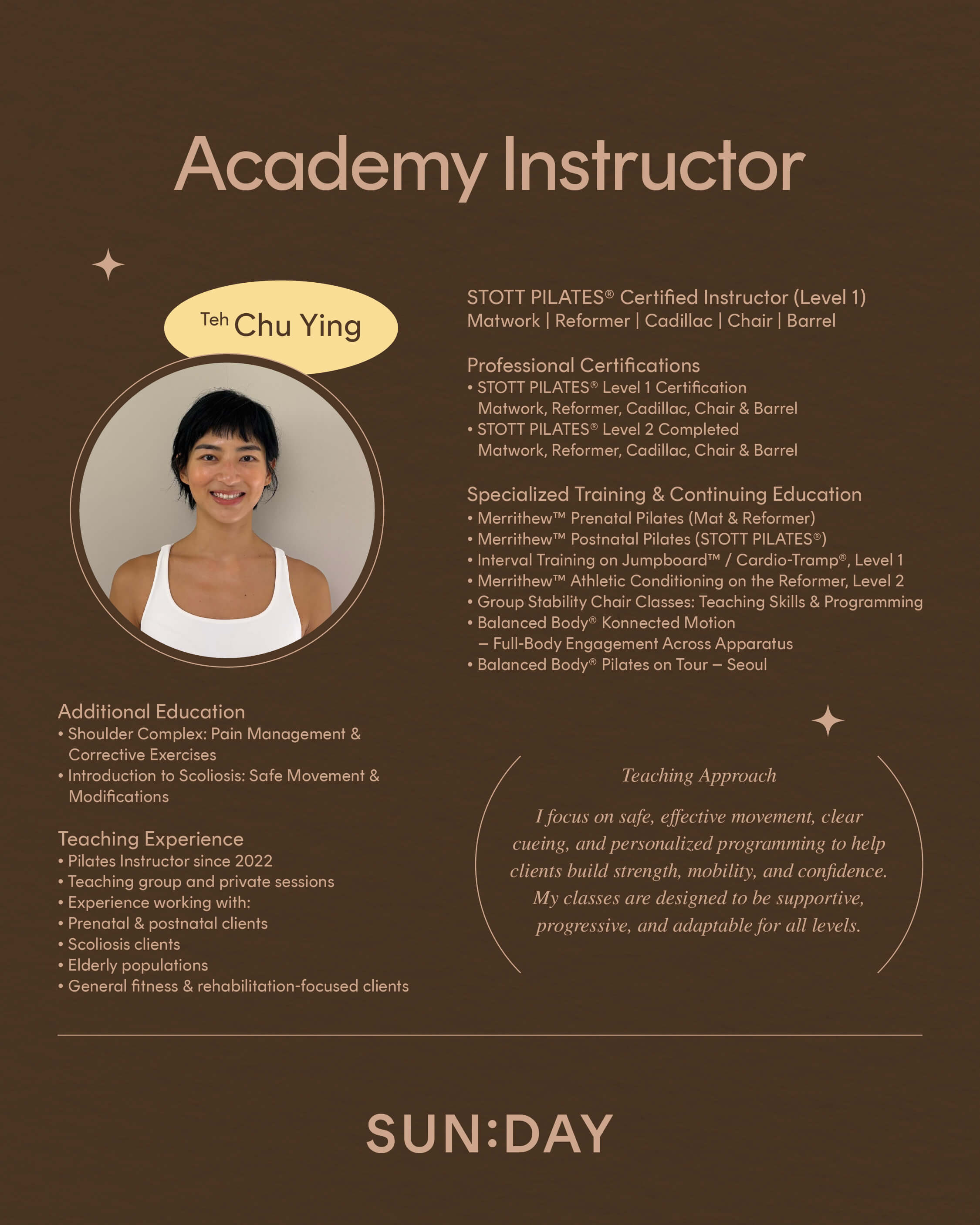 To become a certified SUN:DAY Academy Pilates instructor, you must fulfill the following: